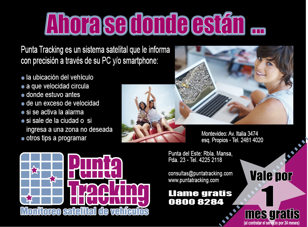 PUNTA TRACKING es un sistema de monitoreo satelital de vehículos, basado en tecnología GPS (Global Positioning System / Sistema Global de Navegación por Satélite), Telefonía Celular e Internet. Permite conocer la ubicación del vehículo en tiempo real y hasta revisar la grabación de los 60 días anteriores.