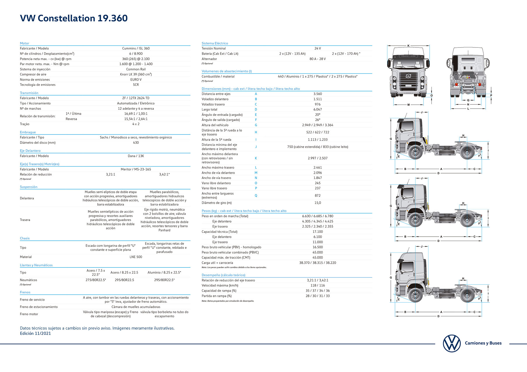 Constellation 19.360 con transmisión mecánica ZF de 16 velocidades. Volkswagen tiene un peso bruto total combinado de 40.5 toneladas. Es una de las cabinas más cómodas del segmento y su equipamento prime la convierte en un excelente lugar de trabajo.