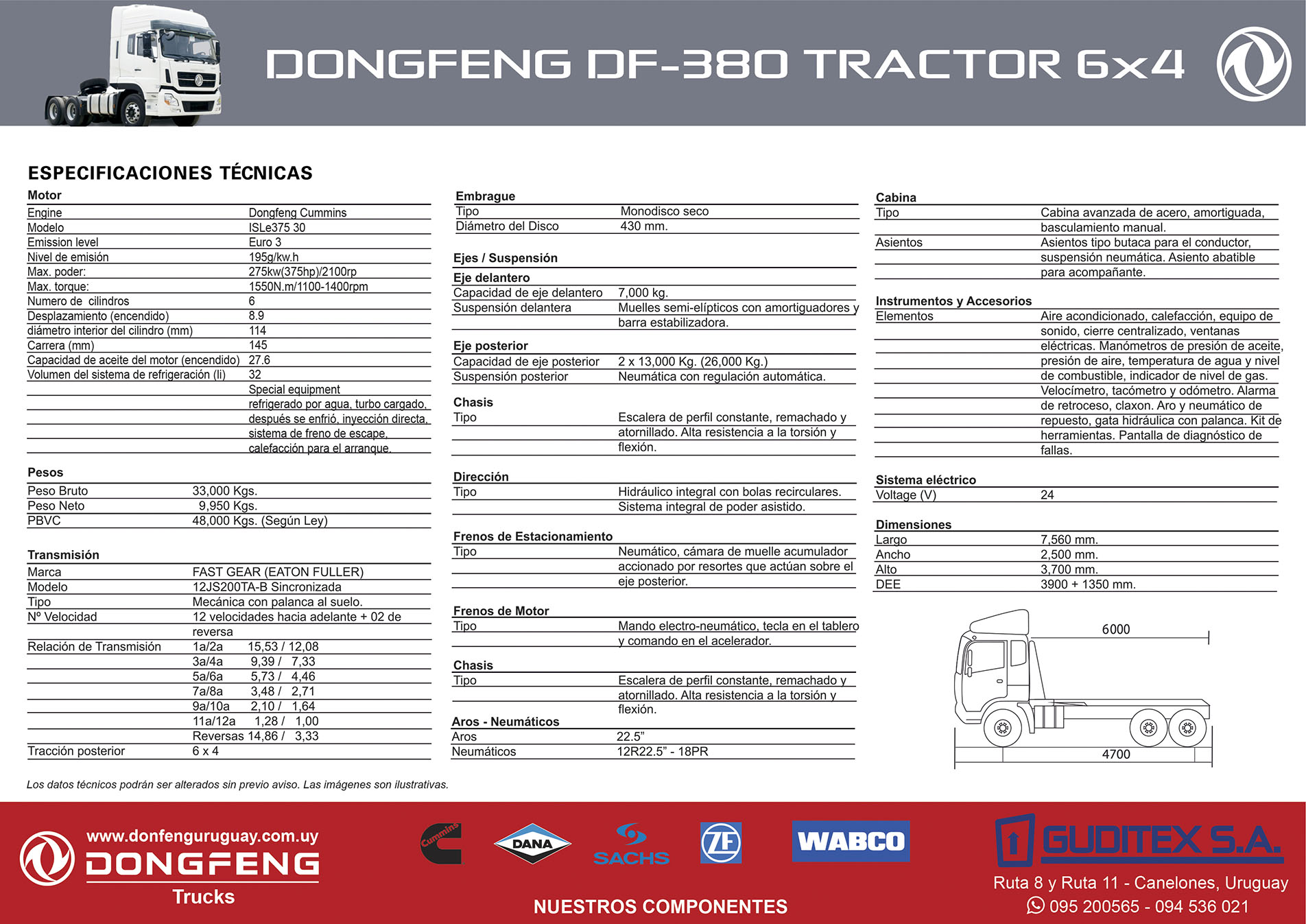 Camión pesado DONGFENG modelo DF-380 6X4, tractor. Cabina FULL, última generación. Motor CUMMINS de 380HP de 6.7 litros. Caja de cambios de 14 velocidades. Máximo arrastre permitido