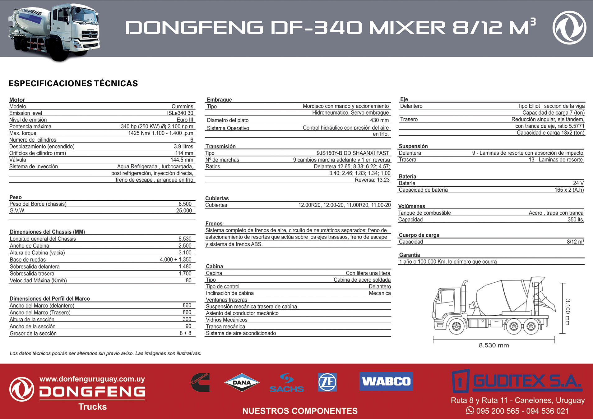- Motor: DONGFENG CUMMINS 340 HP, 6 cilindros, con sistema de agua refrigerada, turbo cargada, post refrigerada, inyección directa, freno de escape y arranque en frio.