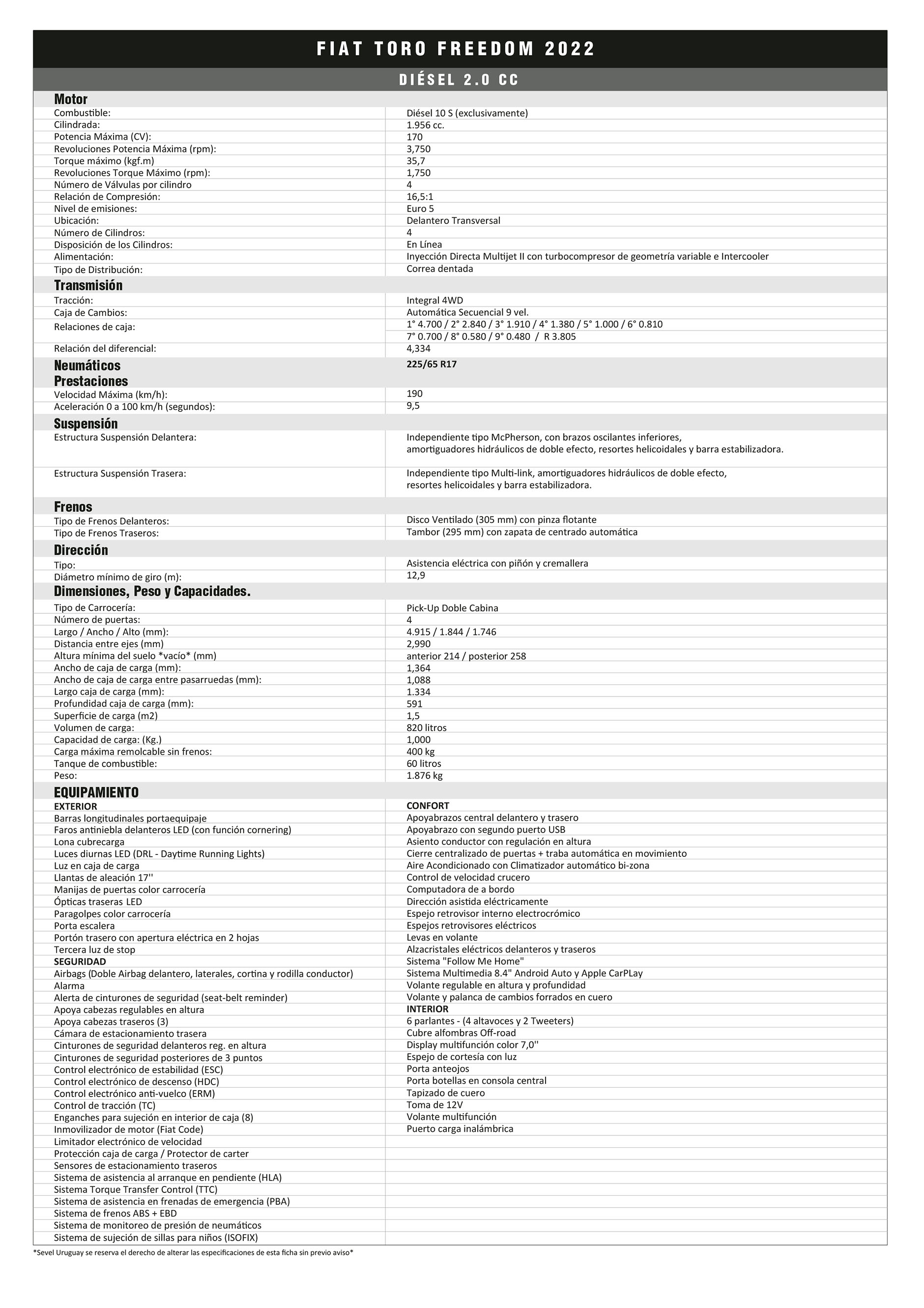 FIAT TORO FREEDOM 2.0 CC TD AT9 4X4 170CV EXTRA FULL | La pick up más completa del segmento