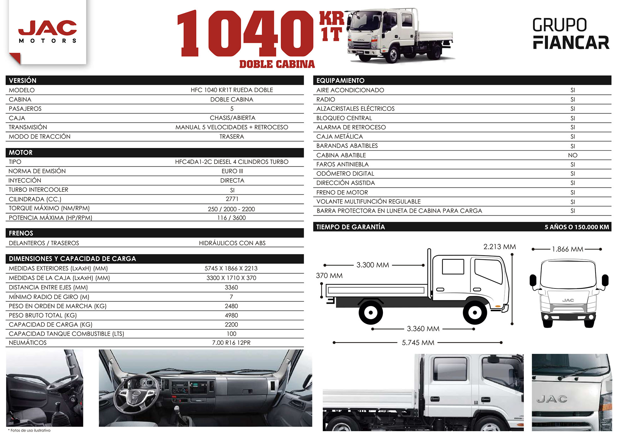 MODELO DEL MOTOR: El JAC 1040 DC cuenta con un motor Diesel de 4 cilindros Turbo