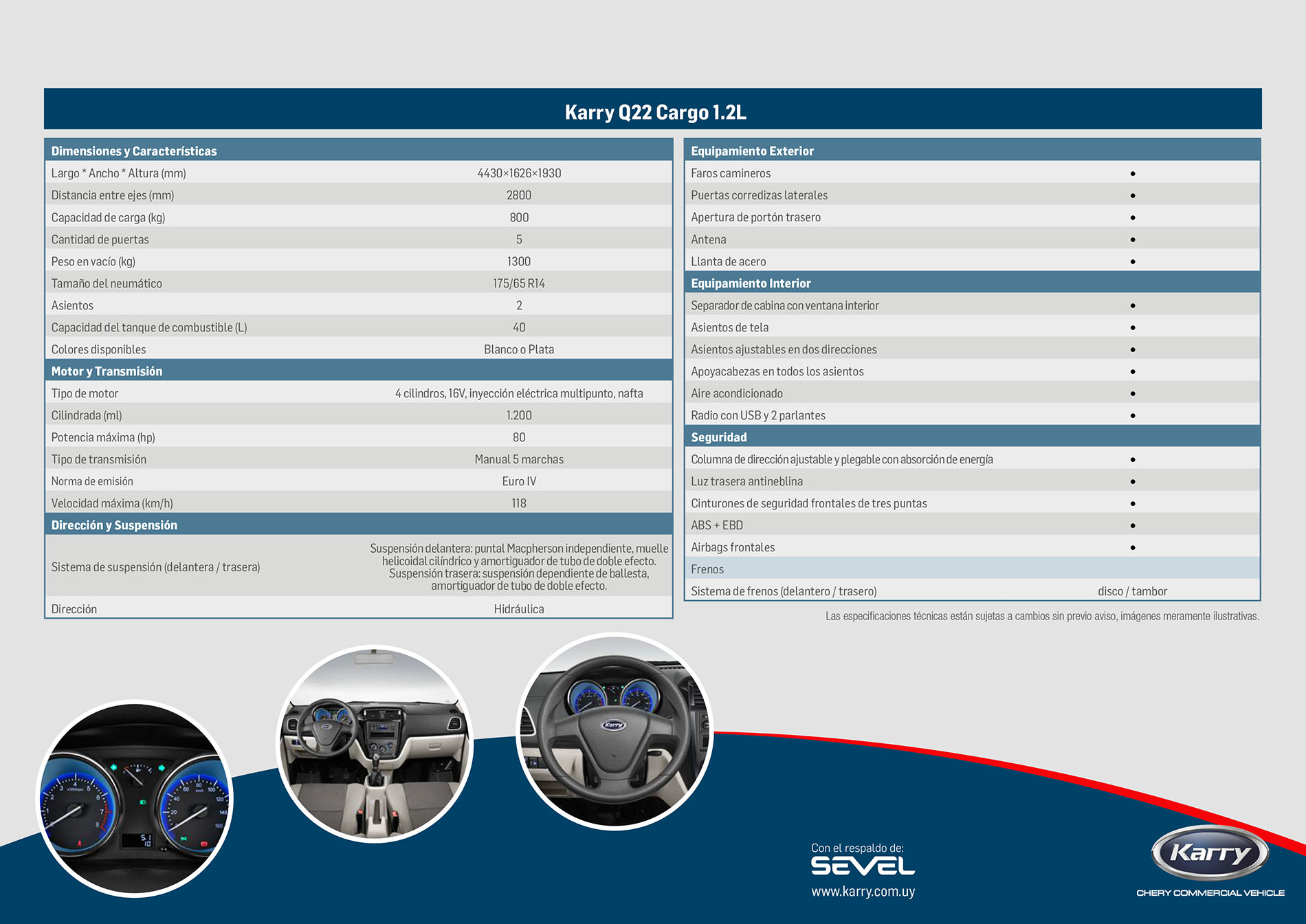 La seguridad necesaria para viajar con tranquilidad. El Furgón de Karry posee dirección asistida, airbags frontales y sistema de frenos antibloqueos (ABS). Además, columna de dirección ajustable y plegable con absorción de energía, sistema de reparto electrónico de frenado (EBD) y luz trasera antiniebla cumpliendo con todos los estándares de seguridad.