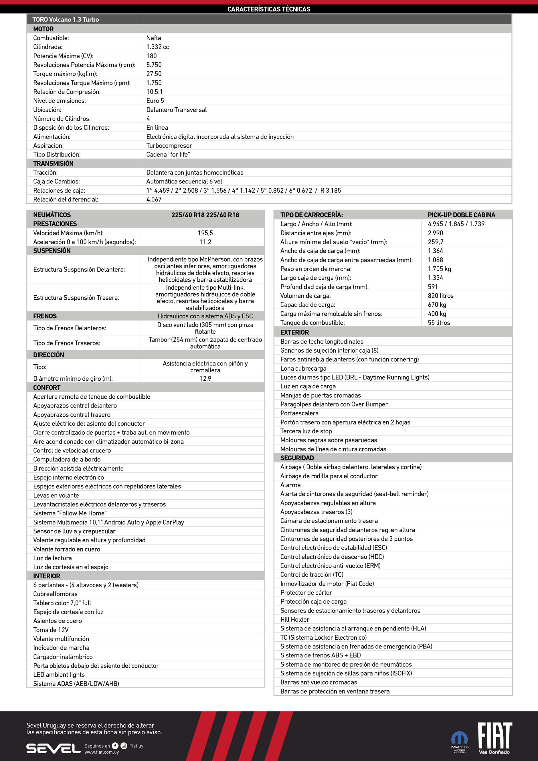 FIAT TORO VOLCANO 1.3 CC AT6 4X2 180 CV EXTRA FULL | La pick up más completa del segmento