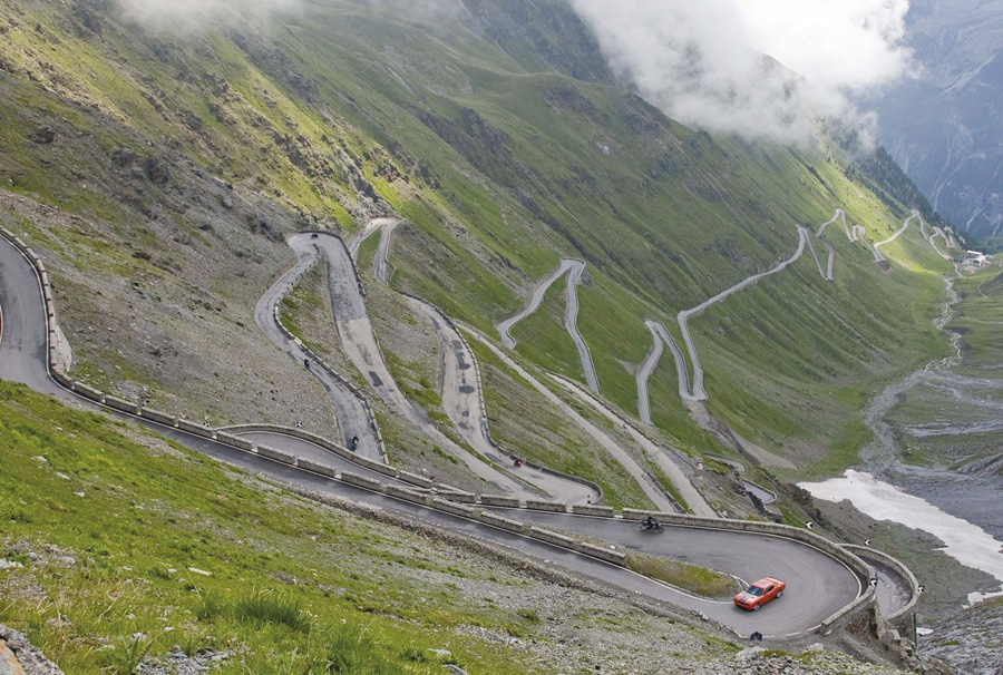 Debido a su emplazamiento entre las fronteras austríaca, suiza e italiana, el paso tuvo una gran importancia estratégica durante años y fue escenario de algunos combates armados durante la I Guerra Mundial. Una tras otra, las 48 curvas se extienden a lo largo de 24 kilómetros de distancia, con un desnivel medio del 7,5%.