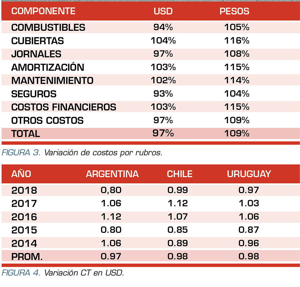 En dicha figura, se puede apreciar como la evolución de los costos de transporte en los últimos cinco años en los tres países ha sido similar. En 2018, se destaca una disminución del 20% de los costos en USD en Argentina, lo cual impacta directamente en la competencia internacional por fletes entre Argentina-Uruguay. La situación de Argentina se explica porque a pesar de un aumento en un 62% de los costos de transporte, la devaluación de la moneda fue superior al 100%.