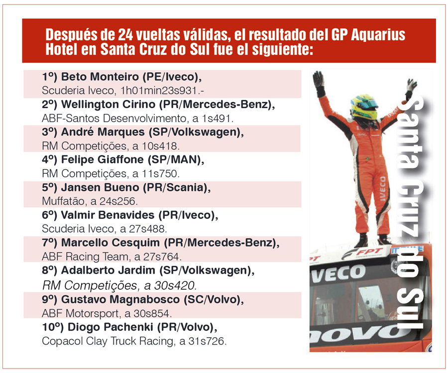 El Campeonato Brasileño de Fórmula Truck conoció a su segundo ganador de la temporada 2014. Después de las cinco victorias consecutivas de Leandro Totti, fue el pernambucano Beto Monteiro de la Scuderia Iveco, el primero en cruzar la línea de meta en el GP Hotel Aquarius, en la sexta etapa de la temporada. La carrera tuvo lugar en Autódromo Internacional Oswaldinho de Oliveira, en la ciudad de Santa Cruz do Sul (RS).