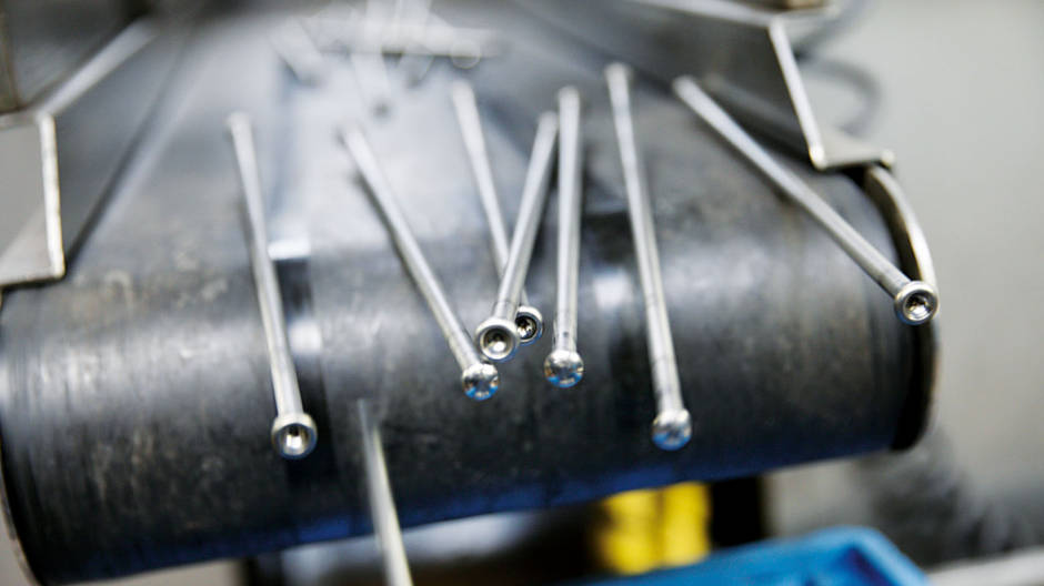 Para algunas de ellas, el proceso de limpieza continúa en el baño por ultrasonidos; para otras, como, por ejemplo, los volantes de inercia, en la cabina de chorro de arena. Las bridas del colector de escape se limpian a mano cuidadosamente en un proceso de granallado con microesferas de vidrio para lograr una superficie de apoyo lisa para la junta. Y los taqués, por ejemplo, reciben un acabado con un proceso de chorreado en húmedo. Estos procedimientos de limpieza solo se pueden aplicar a escala industrial, y son imprescindibles para alcanzar la calidad deseada. «La más mínima partícula causaría un desgaste tremendo desde las primeras revoluciones en el cigüeñal, y eso podría reducir considerablemente su vida útil», afirma Bohn.