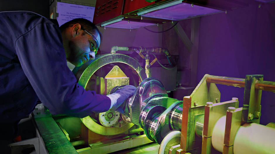Luego pasan al análisis de grietas en la cabina de rayos ultravioleta. Aunque se hayan dedicado ya varias horas de trabajo y de maquinaria al cigüeñal, solo pasarán a la fase de acabado en la máquina lapeadora los cigüeñales que no presenten ninguna grieta. Al final del proceso, todas las superficies funcionales presentan una calidad de serie. Lo mismo se aplica al bloque motor. Para ello se ha introducido aquí un proceso único en el mundo en el reacondicionamiento de motores. Tras diversas tareas y mediciones previas, las superficies de separación para las culatas son recubiertas con una capa de metal de varias décimas de milímetro en un proceso LDS (proyección térmica). A continuación, el parque de maquinaria de la producción en serie vuelve a poner el bloque motor a punto, se le añaden las camisas del cilindro y se somete a una prueba de estanqueidad.