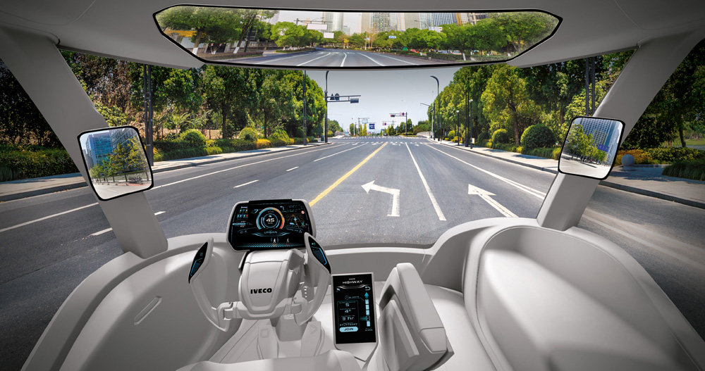 El diseño centrado en el conductor apunta a alcanzar cero estrés y cero pérdida de tiempo. La cabina no presenta las limitaciones tradicionales y puede configurarse según los distintos usos (conducción, conducción automatizada, trabajo de oficina, descanso). Por su parte, la IMH (interfaz máquina-humano) puede configurarse de modo que proporcione la información según fuese necesaria: la información correcta, en el momento correcto y en el lugar correcto.