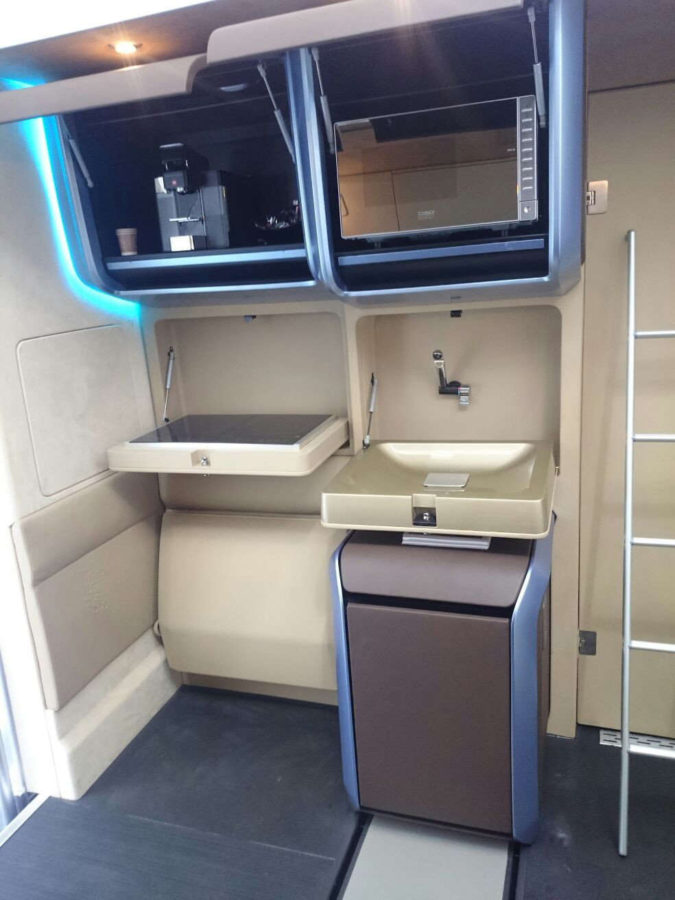 La cabina puede convertirse rápidamente en un despacho gracias a un gran escritorio retráctil equipado con todo lo necesario para trabajar. Además, puede transformarse en un cuarto de baño equipado con una ducha y un inodoro retráctil. Fuente: http://actualidad.rt.com/