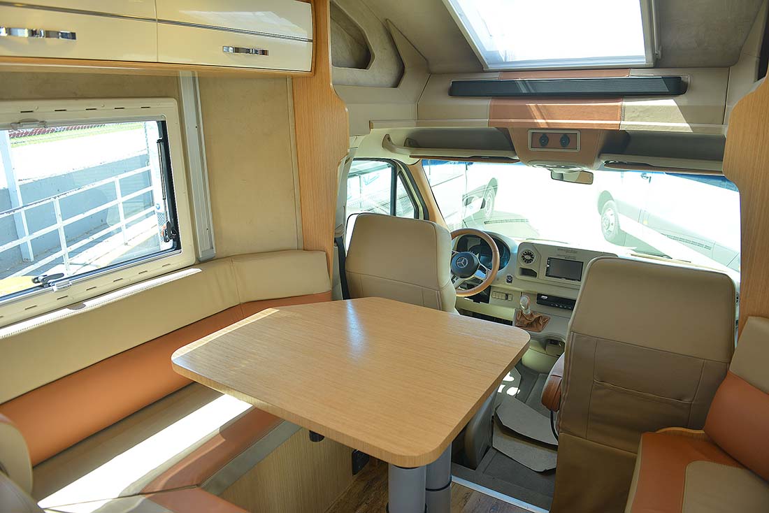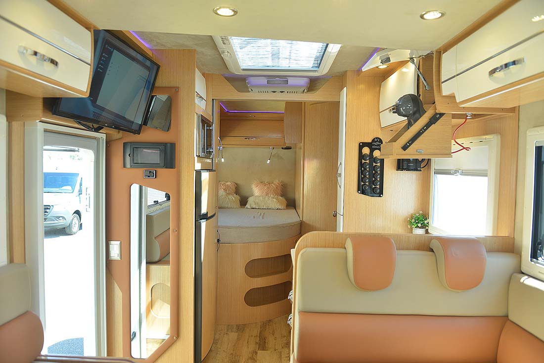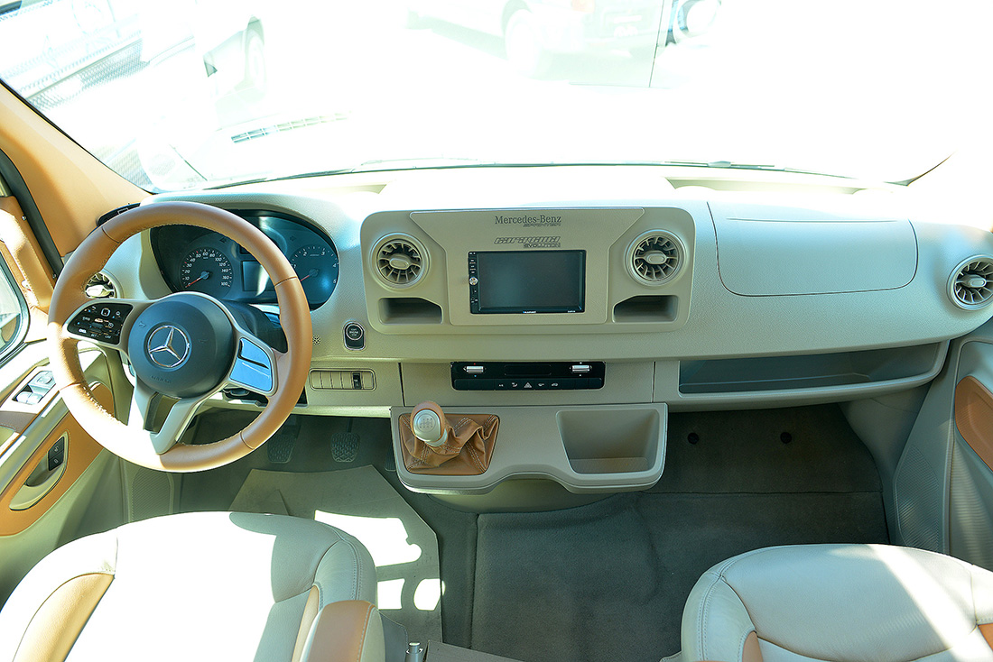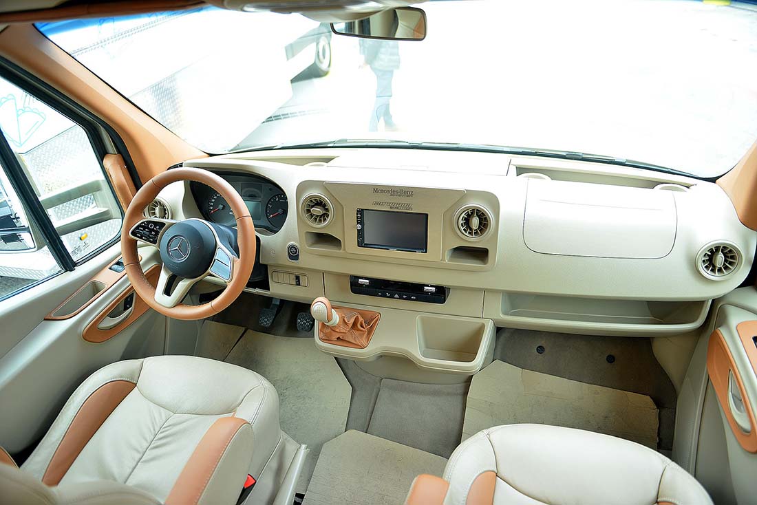 La unidad cuenta, dentro de su equipamiento, con grupo electrógeno insonorizado, calefacción por tuberías a gas-oil, aire acondicionado, heladera trial inteligente con freezer, parrilla a gas, smart TV, barra de sonido, cafetera de cápsulas, horno y microondas, termotanque, ventanas de acrílico doble, toldo automatizado, sistema de domótica smart home mobile, además de tapizados en cuero y detalles de categoría, que conjuntamente con un refinado diseño interior, sin lugar a dudas hacen de la Sprinter un vehículo de alta gama.