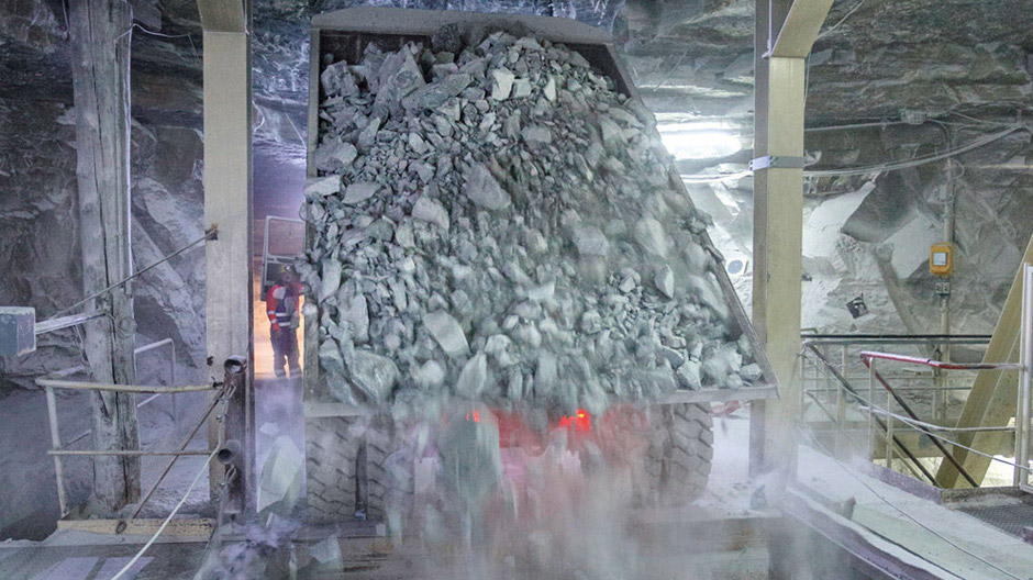 Una vez cargado el tren articulado, el Zetros se pone en marcha de inmediato. Las galerías subterráneas tienen como máximo seis metros de ancho y cuatro de alto. Y solo las rutas principales están iluminadas con tubos de neón en el techo. El destino del Zetros es la trituradora. Dicho equipo está a unos dos o tres kilómetros de distancia, según dónde se encuentre el punto de carga. En él se tritura el material. Los fragmentos resultantes no deben medir más de 6,5 centímetros. Después, una cinta se encarga de transportar los fragmentos de roca hasta la superficie, directamente a la planta de procesamiento. Allí se muele aún más el mineral y se incorporan aditivos. Y ya está listo el pavimento.