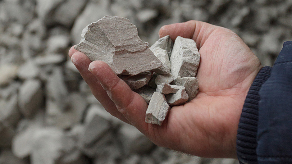 El polvo que se desprende llena las galerías, obstruyendo la visión. Con gran estruendo caen unos pedruscos de anhidrita del tamaño de pelotas de fútbol desde la cuchara de la cargadora al semirremolque del Zetros. Al tacto, el mineral resulta duro y frío. «Tiene una dureza increíble», cuenta Beltz. Bajo tierra, la temperatura es agradablemente fresca: 14 grados Celsius constantes.