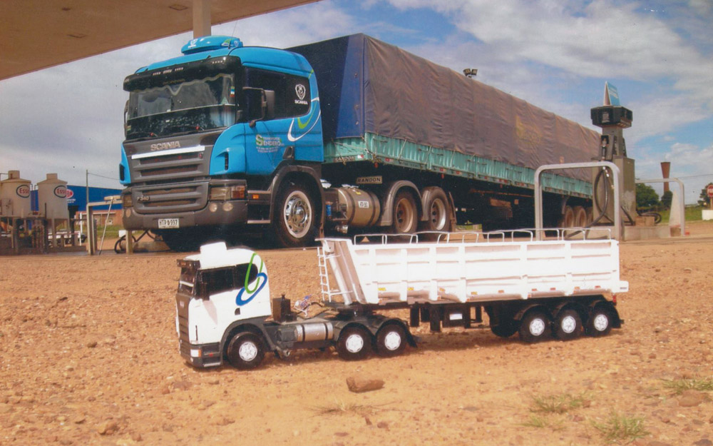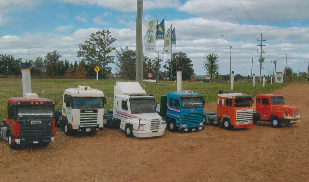Entre sus desafíos, el Scania 124 de trompa fue uno de los difíciles de desarrollar. Todos sus modelos poseen hasta los más mínimos detalles, se pueden apreciar en el parabrisas de sus modelos stickers del MTOP y seguro, Sucta y hasta del telepeaje. “Tengo los moldes ya que hice varios modelos de camiones y cuando me piden uno nuevo le sacó fotos de todos lados para ver los detalles y ahí los desarrollo”.