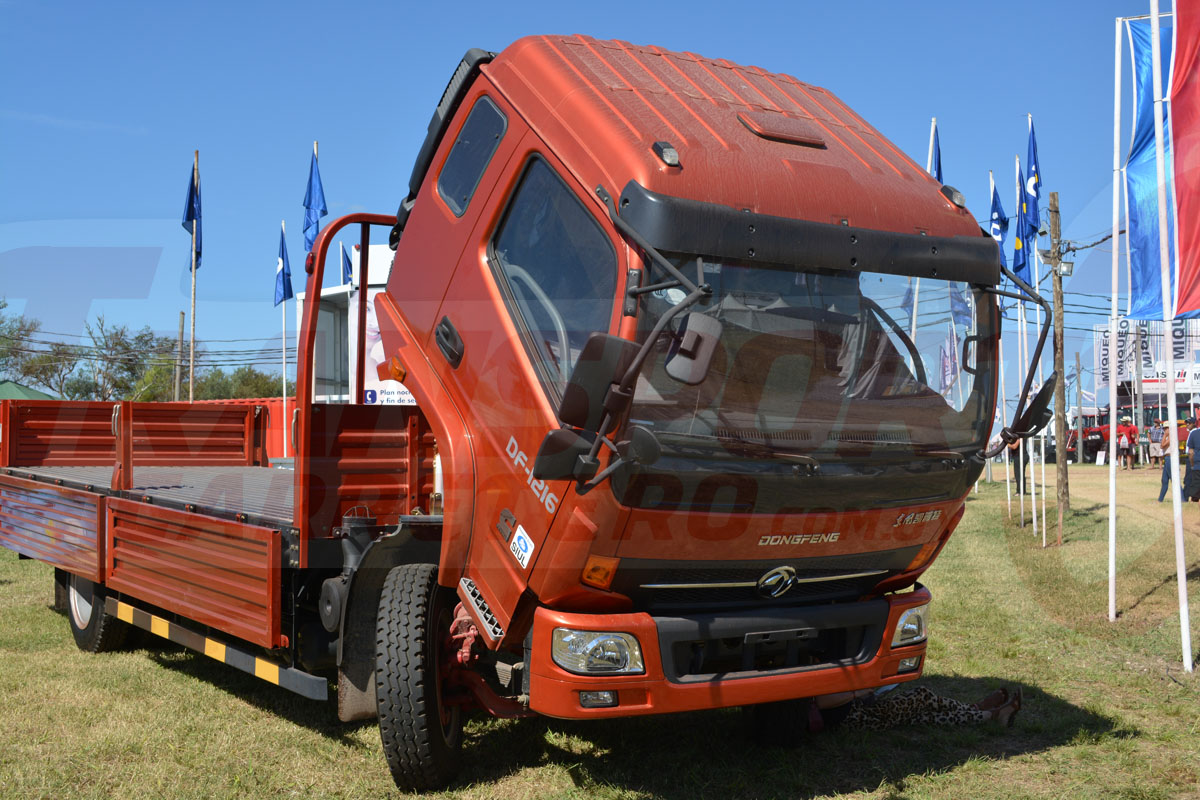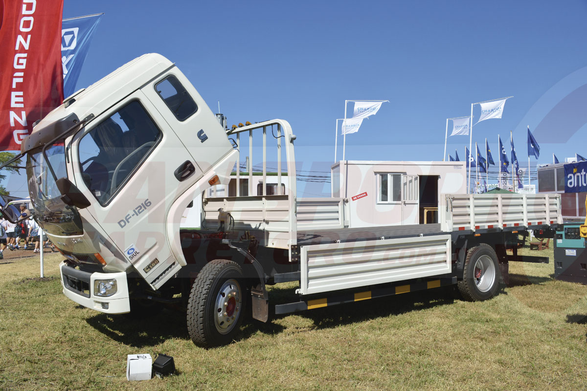Comenzando a recorrer el stand nos encontramos con el modelo DF 1216 con caja de barandas rebatibles de origen que viene equipado con motor Cummins de 4 cilindros, 3.9 litros, sistema de inyección electrónica con bomba de alta presión y common rail. Cuenta también con toma de fuerza y una capacidad de carga con la caja de 7670 kilos. En cuanto a las dimensiones, el largo total es de 8.400mm, la distancia entre ejes es 4.700 mm, el ancho de la cabina es (s/espejos) de 2.180mm y la altura 2.600mm.