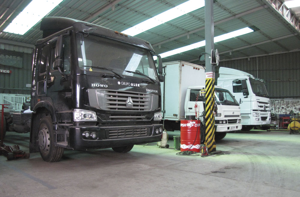 Para conocer detalles de la política de la empresa nos dirigimos a Camino Fauquet 7528 bis, donde están los talleres Moncar, servicio oficial de la marca que es atendido por su propietario Mariano Reyes y su equipo. Allí además fuimos recibidos por José María Reyes, asesor técnico y vendedor de Grupo Aler, y Ruben de los Santos, responsable de ventas de Sinotruk para Grupo Aler.