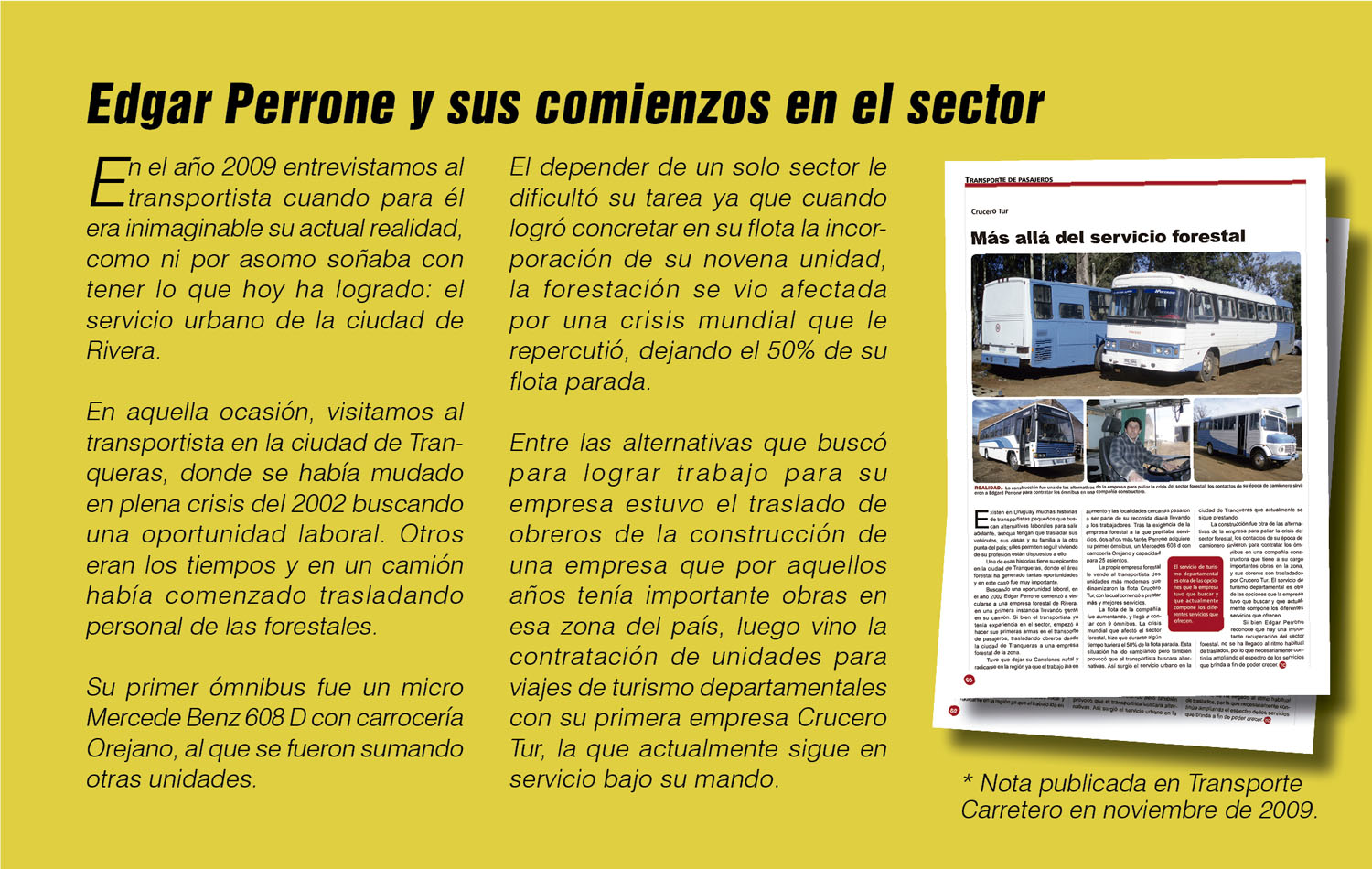 COR Lda. es una de las empresas más nuevas que realiza el servicio urbano en el interior, y se destaca porque en su corta trayectoria ha logrado importantes avances para sus usuarios. Edgar Perrone, director de la empresa, no es nuevo en el sector ya que desde hace varios años se desempeña en la zona de Tranqueras, en donde llegó a contar con 10 ómnibus haciendo servicios de transporte de personal para la industria forestal.