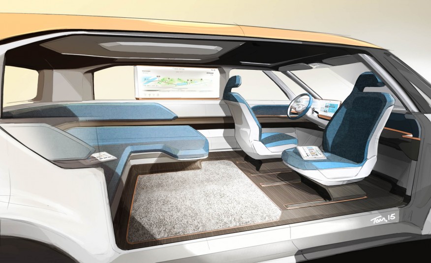 A nivel interior encontramos un diseño muy vanguardista, en el que se sustituyen los botones y mandos de toda la vida por mandos táctiles y donde hay tres pantallas curvas envolviendo al conductor, completamente configurables. También incorpora una banqueta trasera de tipo sofá, un volante con superficies táctiles, sistema de reconocimiento de voz (capaz de atender órdenes del tipo "sube la calefacción"), así como control por gestos, pero no únicamente para el sistema de infoentretenimiento, ya que los pasajeros pueden hasta abrir las puertas con un simple movimiento.