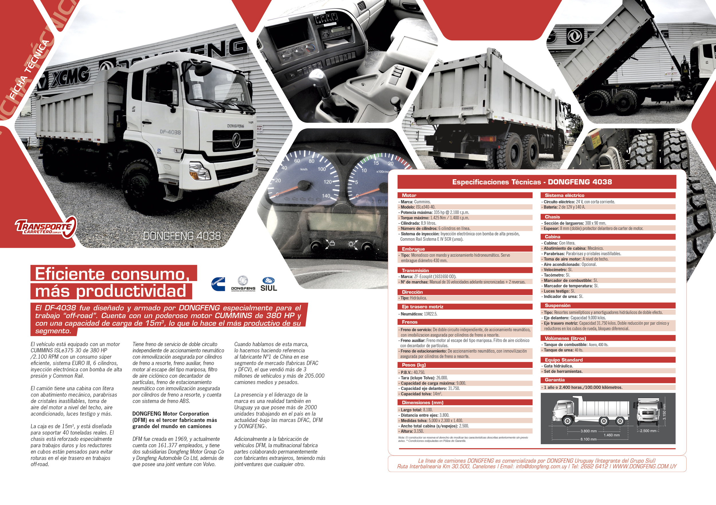 El DF-4038 fue diseñado y armado por DONGFENG especialmente para el trabajo “off-road”. Cuenta con un poderoso motor CUMMINS de 380 HP y con una capacidad de carga de 15m3, lo que lo hace el más productivo de su segmento.