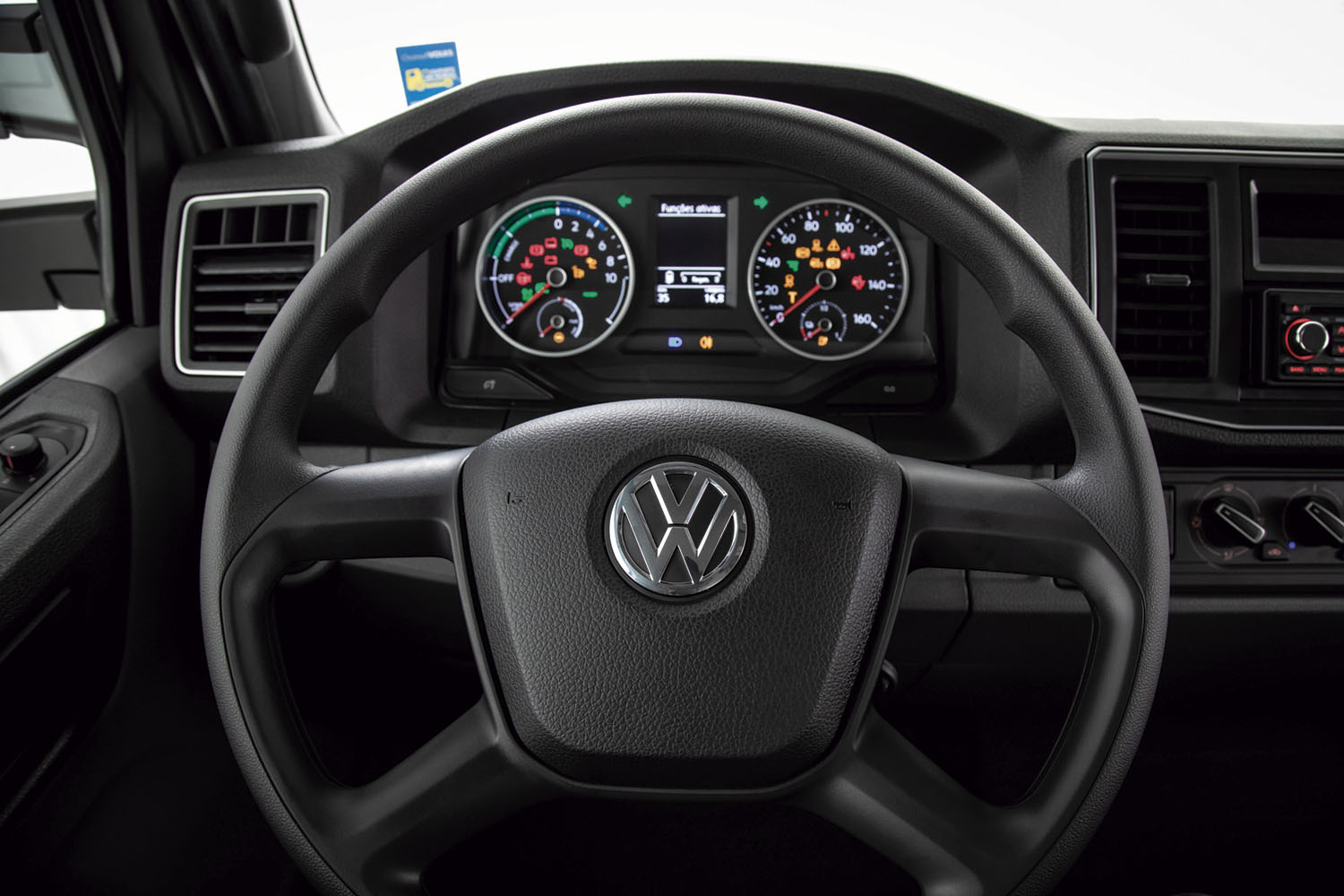 El conductor estará a bordo de la cabina con el mejor espacio interno de su categoría, mientras que, de forma sencilla y ágil, visualizará toda la información necesaria para conducir el camión eléctrico VW. En el tablero, encuentra un aspecto personalizado, con datos de autonomía, consumo instantáneo, potencia disponible del vehículo e indicador de niveles de regeneración con selector, entre otros.