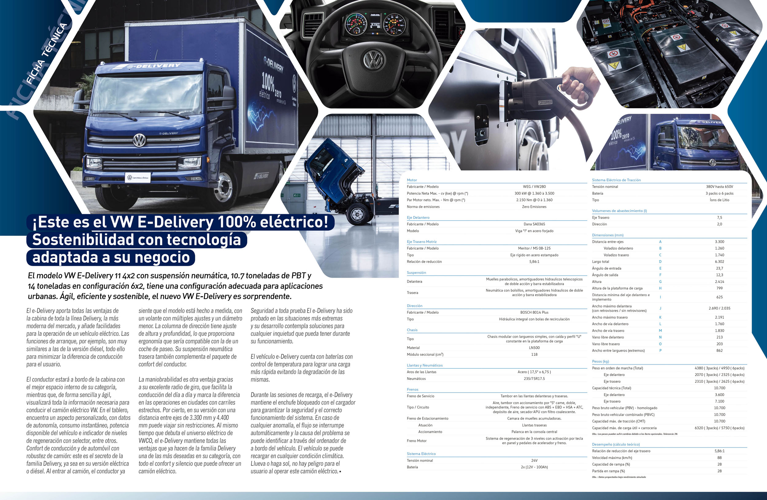 El modelo VW E-Delivery 11 4x2 con suspensión neumática, 10.7 toneladas de PBT y El modelo VW E-Delivery 11 4x2 con suspensión neumática, 10.7 toneladas de PBT y 14 toneladas en configuración 6x2, tiene una configuración adecuada para aplicaciones urbanas. Ágil, eficiente y sostenible, el nuevo VW E-Delivery es sorprendente.