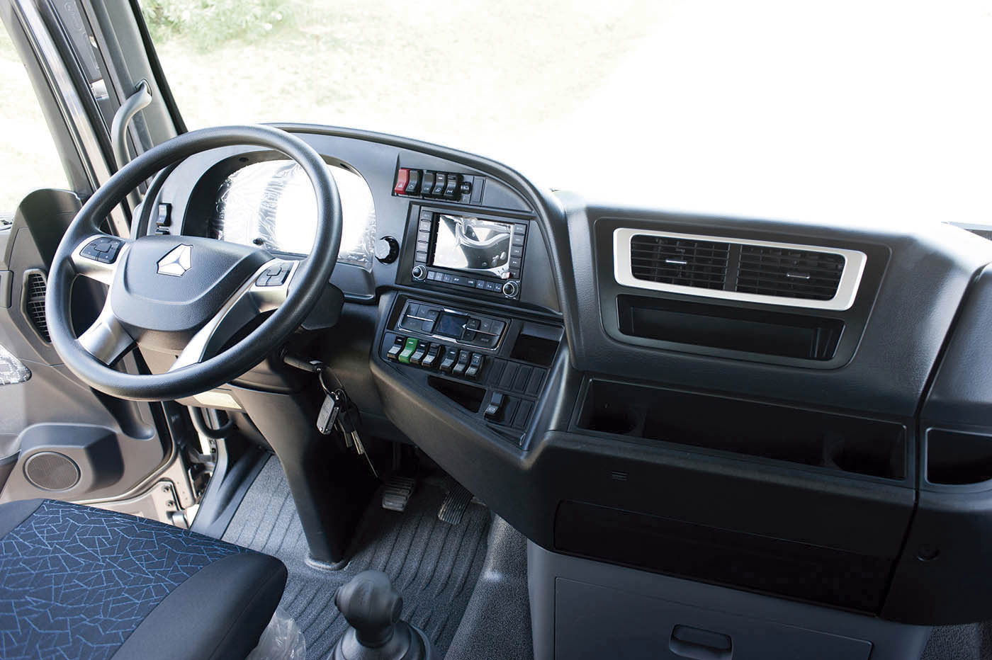 Construida en acero de alta resistencia, basculante a 70º con levante eléctrico, limpiaparabrisas de 3 velocidades, tablero con computador de a bordo, parabrisas laminado, butaca chofer con suspensión neumática, protector ajustable para parabrisas fuera de la cabina, radio AM/FM/MP5, volante regulable en altura y profundidad, bocina de aire, aire acondicionado con climatizador digital, vidrios eléctricos, 4 espejos eléctricos, bloqueo central de puertas, iluminación auxiliar de lectura para camas y butaca del chofer.