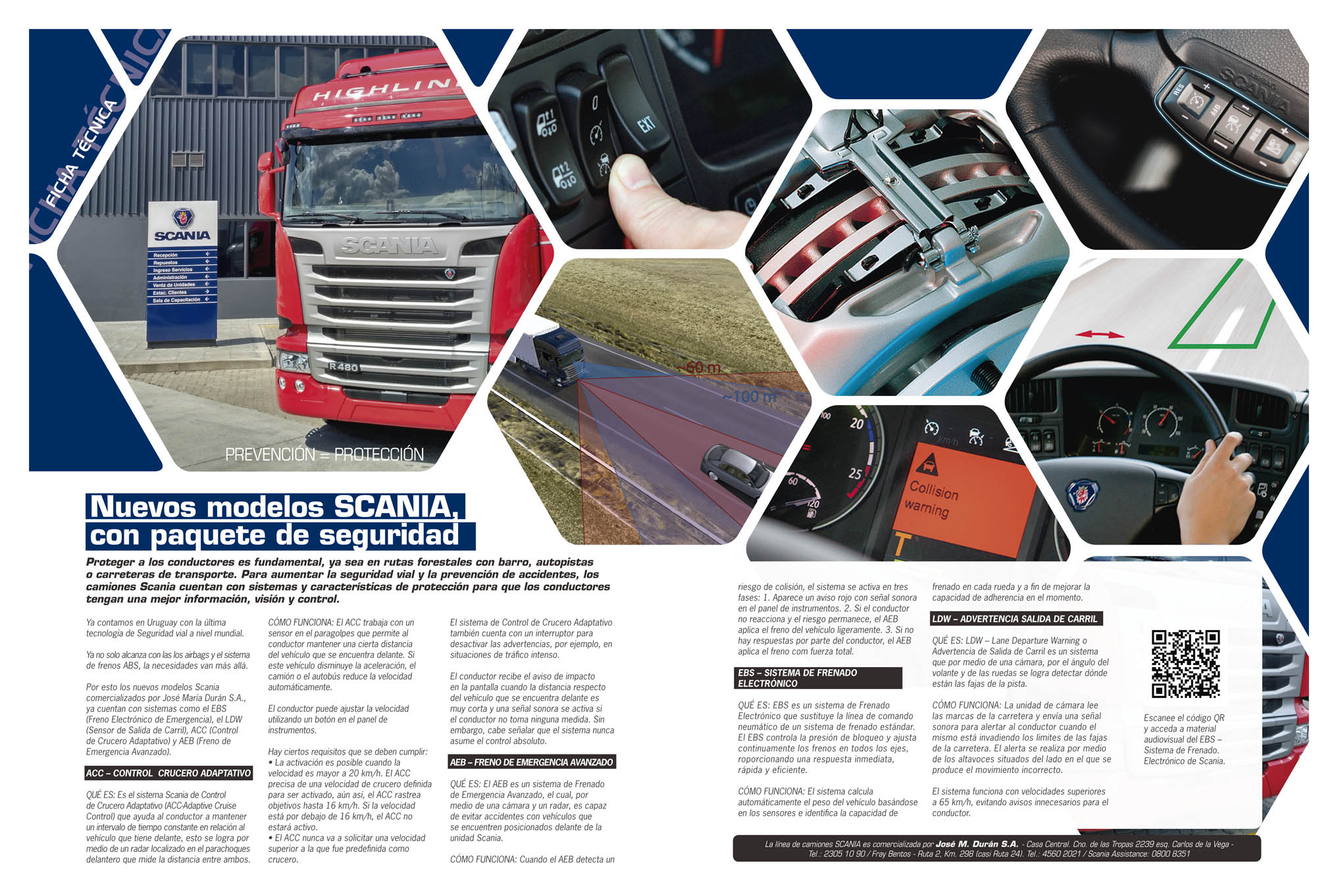 Por esto los nuevos modelos Scania comercializados por José María Durán S.A., ya cuentan con sistemas como el EBS (Freno Electrónico de Emergencia), el LDW (Sensor de Salida de Carril), ACC (Control de Crucero Adaptativo) y AEB (Freno de Emergencia Avanzado).