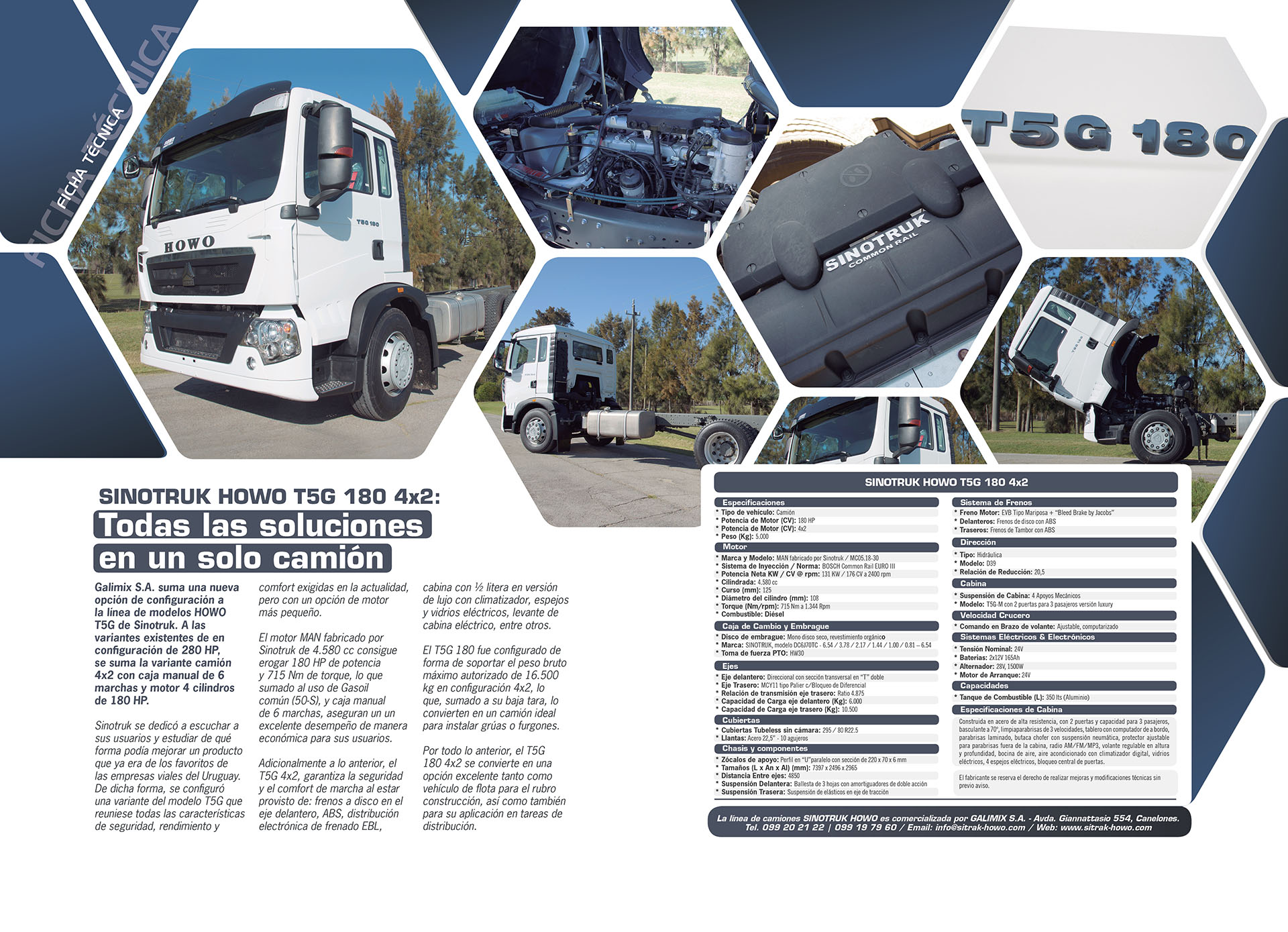Galimix S.A. suma una nueva opción de configuración a la línea de modelos HOWO T5G de Sinotruk. A las variantes existentes de en configuración de 280 HP, se suma la variante camión 4x2 con caja manual de 6 marchas y motor 4 cilindros de 180 HP.Galimix S.A. suma una nueva opción de configuración a la línea de modelos HOWO T5G de Sinotruk. A las variantes existentes de en configuración de 280 HP, se suma la variante camión 4x2 con caja manual de 6 marchas y motor 4 cilindros de 180 HP.
