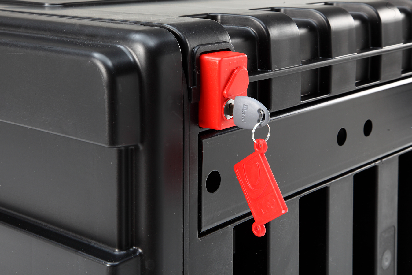 Kompos-it lleva pasadores de serie a lo largo de la parte superior (tres en el caso de la caja de 1200 mm de largo), que se cierran automáticamente al presionar sencillamente mientras se cierra la caja. Un pulsador rojo en la esquina derecha de la parte superior abre la caja con una sencilla presión. Todo el sistema de pasadores se cierra con una llave con combinación única, suministrada con cada kit Kompos-it. Será disponible también la opción de la apertura servoasistida, la cual usa una llave de radio frecuencia para activar la acción motorizada del pasador en las operaciones de apertura.
