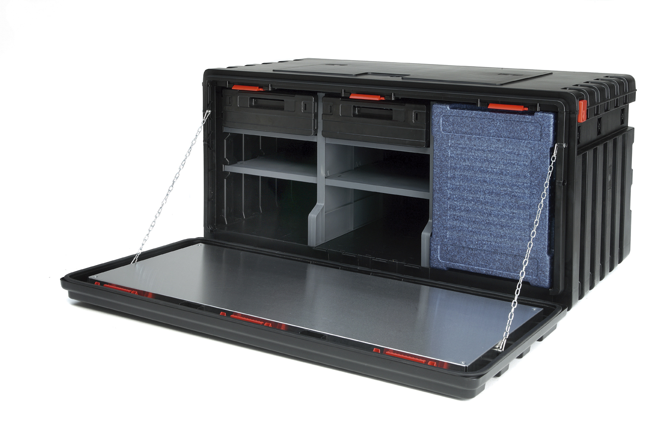 Los cajones corren en guías de fricción con topes de freno para impedir la extracción completa, previniendo así el vertido accidental del contenido. La tapa se cierra para conseguir una adaptación lineal perfecta a la caja, ofreciendo unas juntas a prueba de agua y polvo IP56 y un sistema completo de canaletas que aleja la humedad dirigiéndola hacia el perímetro de la tapadera, de forma que no entre en la caja cuando está abierta.