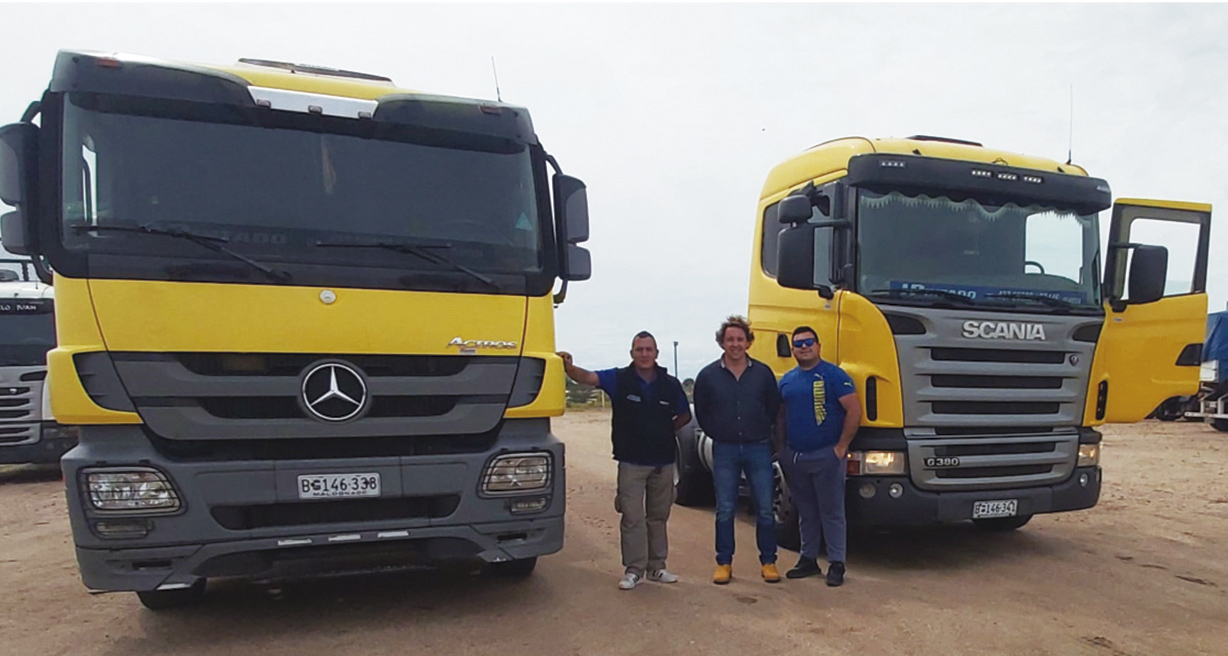 La empresa César Álvarez Logística & Transporte de Paysandú adquirió en Automotora H. Pintado sucursal ruta 5 (taburel) un Scania G 380 y un Mercedes Benz Actros 2641. En la fotografía Luis Faccin y Alejandro Britos recibiendo el vehículo de parte de Roberto Budes.