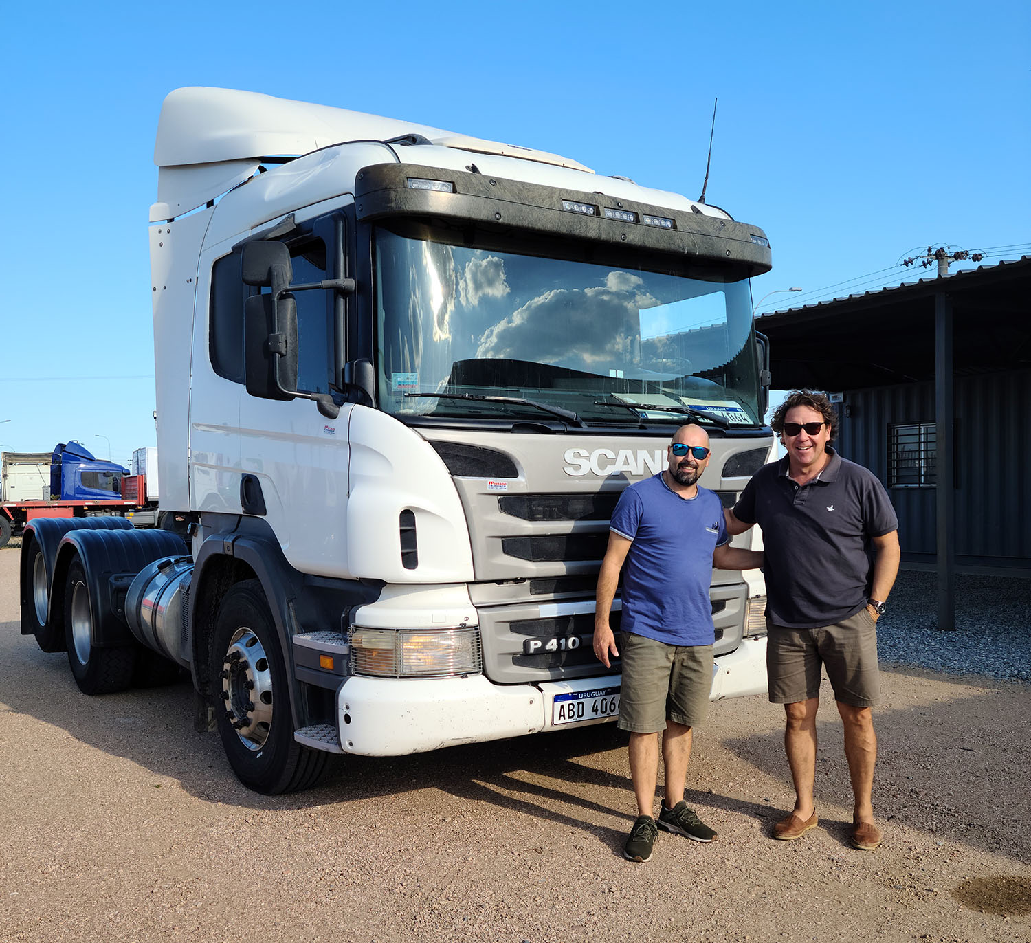 Pepe Millán de J. L. Millán Srl. recibe de manos de Roberto Budes de H. Pintado Camiones un Scania P410 tractor del año 2013 para transporte internacional.