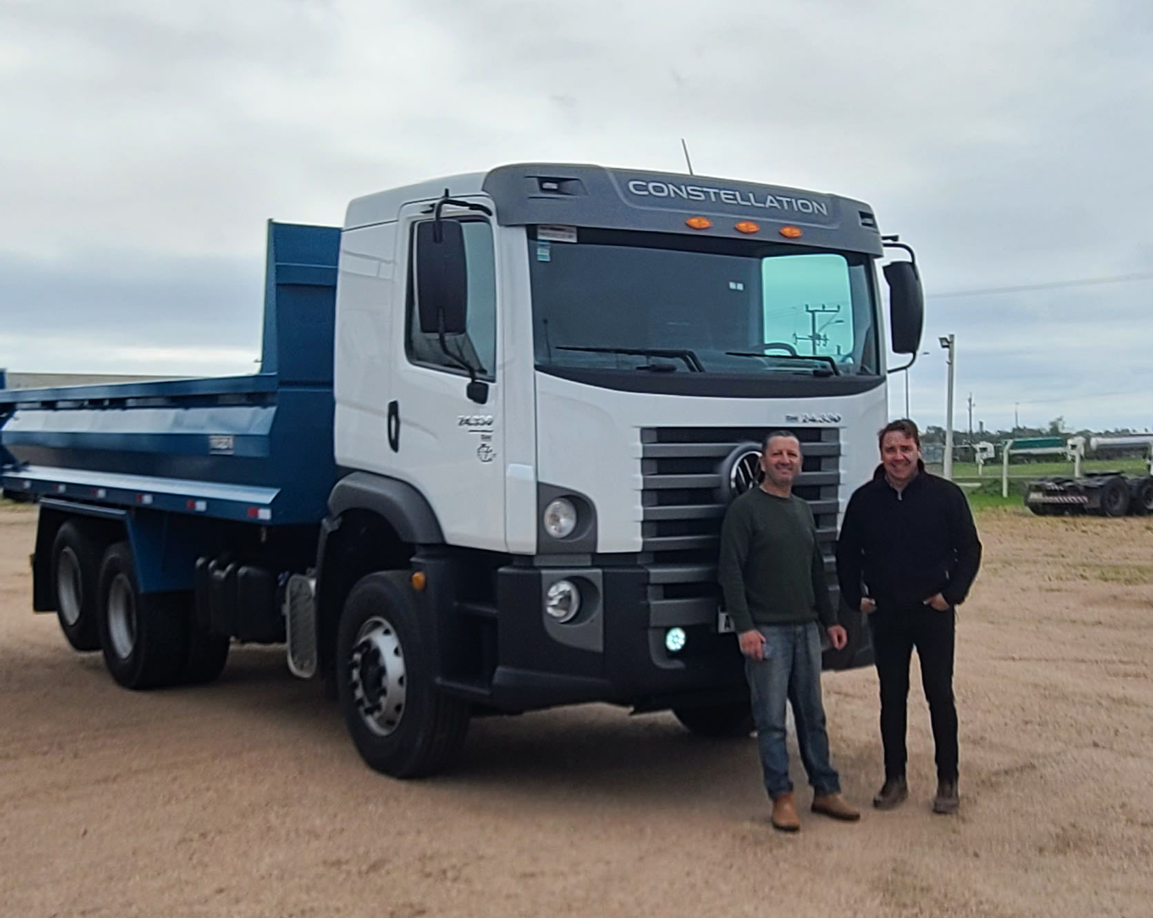 Fabián Suárez recibe su Volkswagen Constellation 24.330 con volcadora de manos de Roberto Budes de automotora H. Pintado sucursal Ruta 5, el transportista trabaja para el MTOP.
