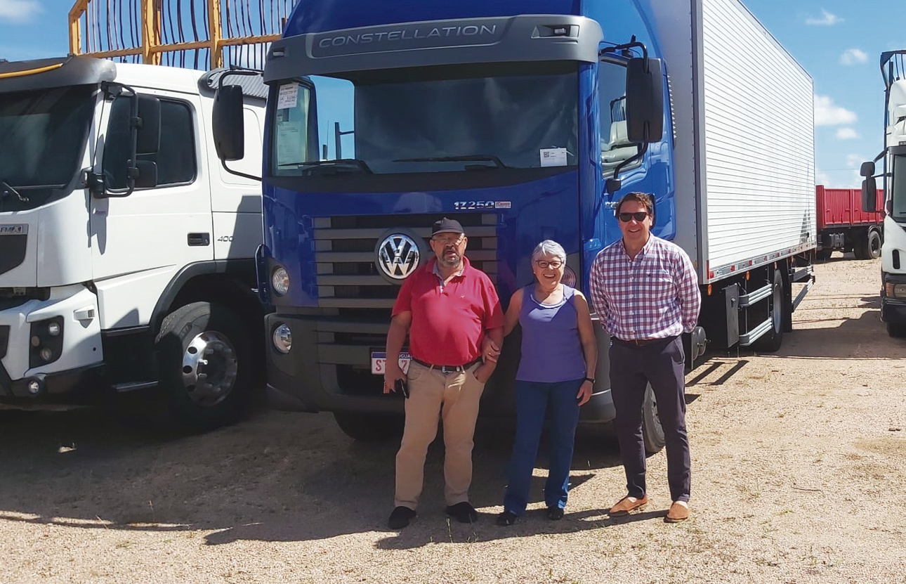 Francisco Castillo y su señora Olga Fernández junto a Roberto Budes de Automotora H. Pintado sucursal Ruta 5 al momento de entregar un Volkswagen Constellation 17.250 con furgón Ibiporá de carrocerías Pablo. Dicha unidad realizará agencia en ruta 8.