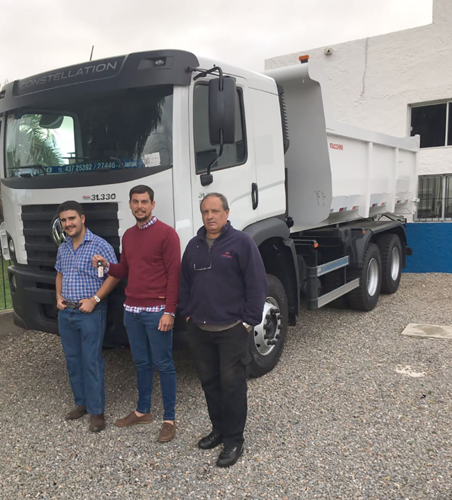 Facundo Pintado y Pedros Santos de H. Pintado Camiones Atlántida, entregaron un camión Volkswagen Constellation 31.330 con volcadora a la empresa Guerisoli y Guerisoli de Bella Unión.