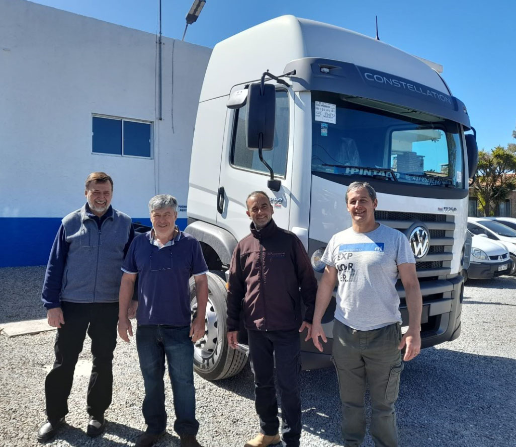 La empresa Juan Antonio Bentancur de Tacuarembó adquirió un Volkswagen Constellation 24.250 0km en H. Pintado Camiones de Atlántida. En la imagen: Franceso Melo, Fabián Olivera, Gabriel Bantancur y Juan Carlos Torterolo.