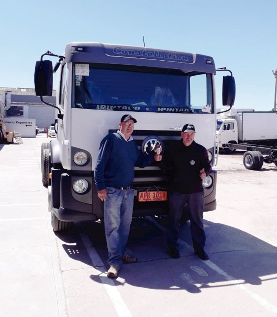 Mario César Durand (izquierda) recibe de Carlos Spinelli, en representación de H. Pintado, el camión VW Constellation 24.250 Techo Bajo.