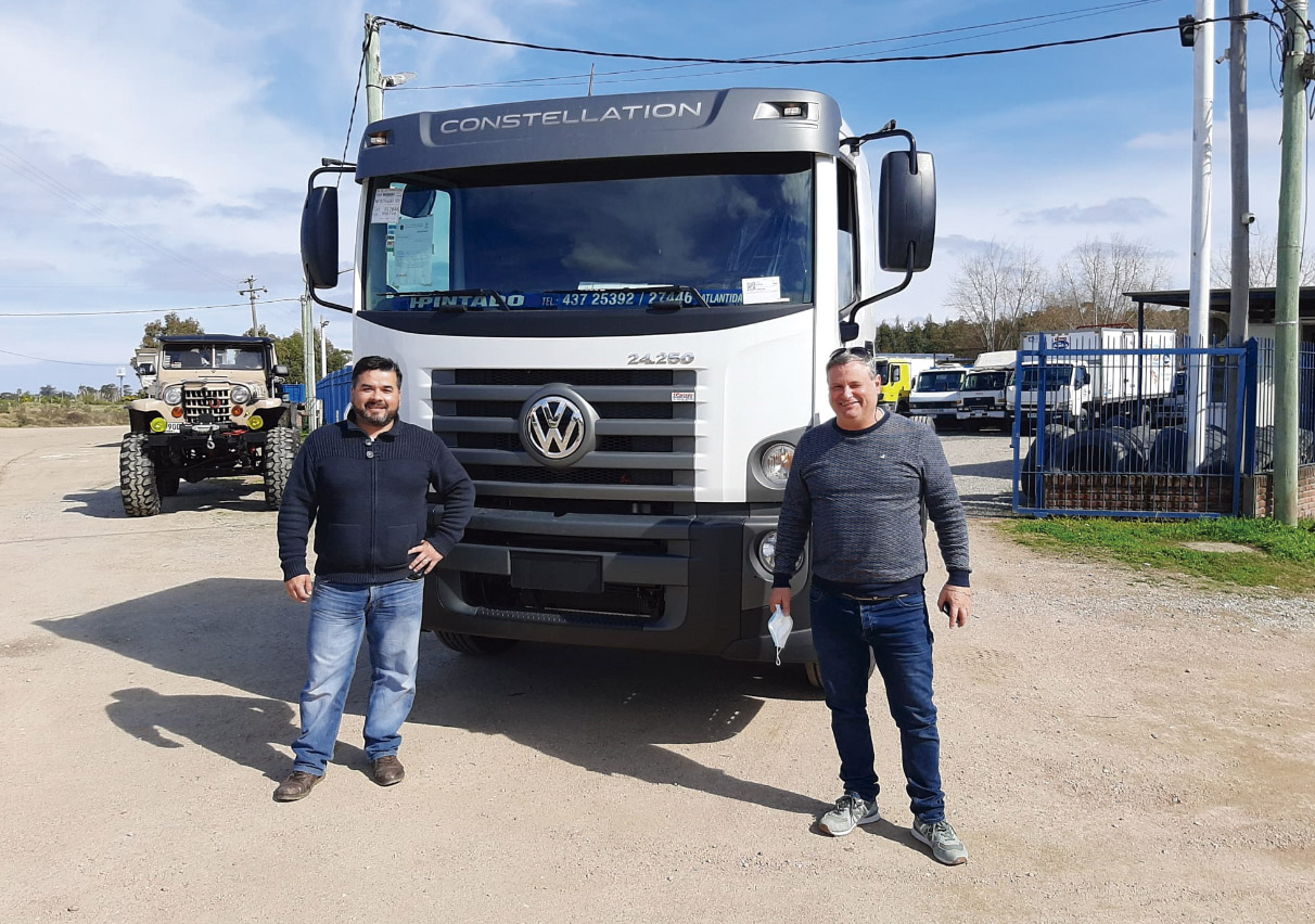 Automotora H. Pintado / Volkswagen: un nuevo Volkswagen Constellation 24250 0km vendido por automotora H. Pintado. En la imagen Moisés Silva (vendedor) y el feliz propietario Pablo Pizzorno.