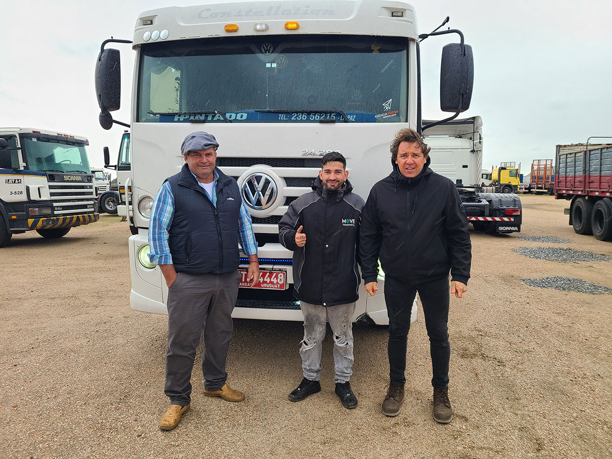 La empresa Move Transportes SRL de la ciudad de Artigas adquirió en H. Pintado camiones sucursal Ruta 5 un Volkswagen Constellation 24.280 para transporte de granos. En la imagen Gabriel y Guillermo Flores junto a Roberto Budes.