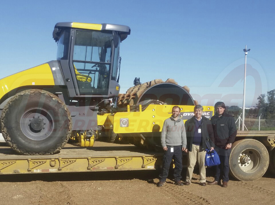 La empresa Traxpalco le compró a José M. Durán un equipo compactador de suelos Dynapac CA250D. Al momento de la entrega, Tomas Belén, Álvaro Mendiondo (Vendedor) y Javier de los Santos (Jefe de Servicios Maquinaria).