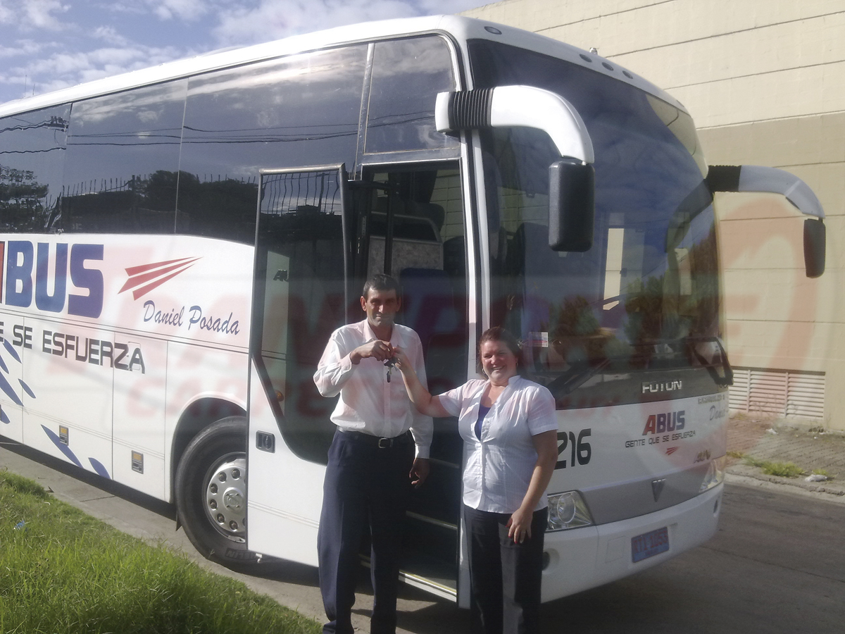 La empresa de Tacuarembó, Daniel Posada, que realiza servicios departamentales y de turismo, incorporó a su flota este año una nueva unidad Foton. En la fotografía Alejandra Lima por Foton le entrega las llaves del vehículo a Waldemar Conde.