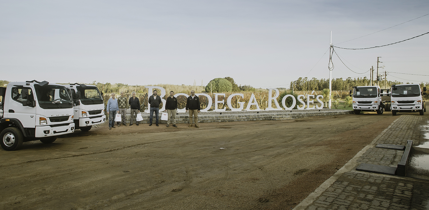 Autolider Uruguay S.A. entregó cuatro camiones Fuso FA a Bodega Roses. En la imagen: Santiago Barreto (vendedor), Richard Cabeza. Recibe: Walter y Pablo Roses.