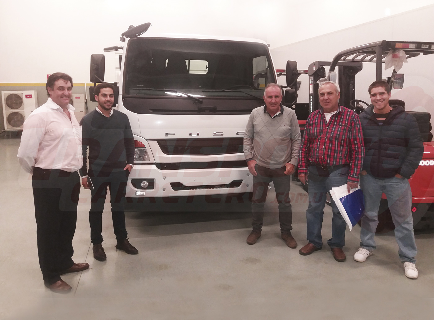 Un nuevo camión Fuso FA fue adquirido por la firma Carmelo Cable Visión Srl. Al momento de la entrega (de izq. a der.): Santiago Cabrera (Autolider Uruguay S.A.), Leonardo Rodríguez, Artigas Silveira, Ramiro Lobecio e Ismael Lobecio.