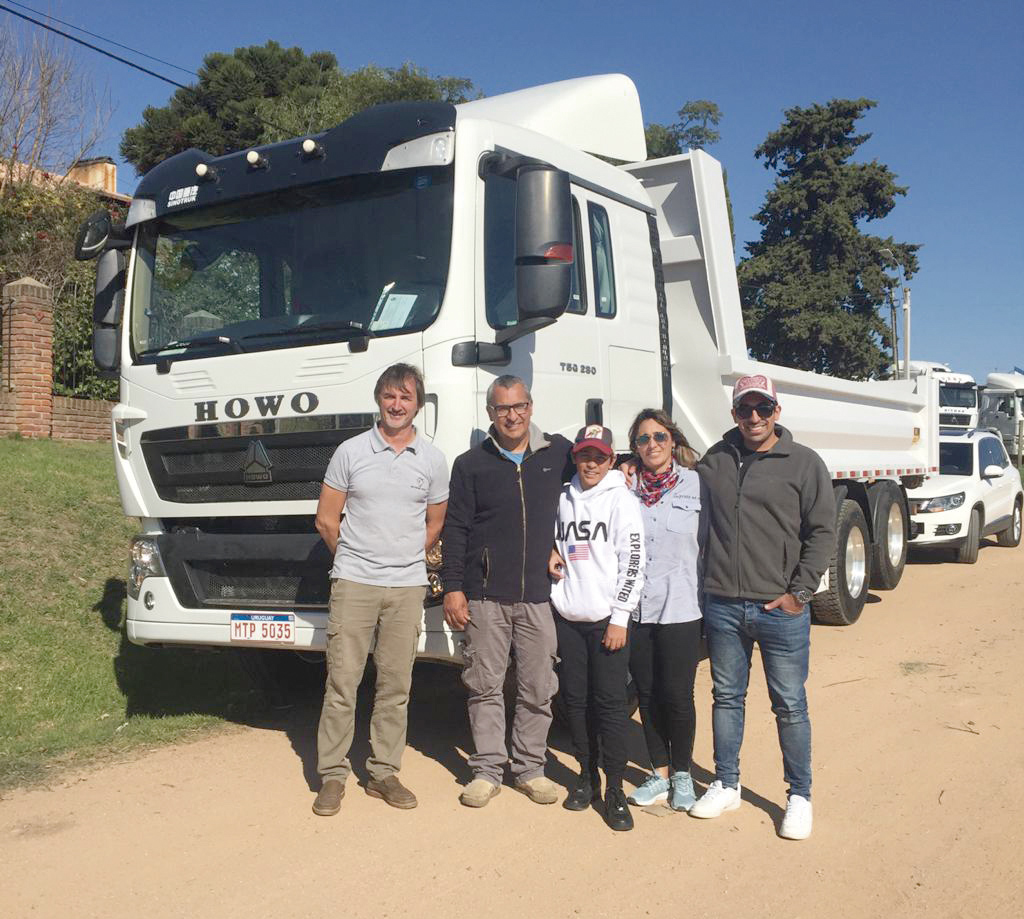 La empresa Carlos Silva de San José recibe un Howo 280hp con Volcadora de 10m3 de Origen para granos. En la foto: Juan Rebasti por Galimix S.A.; Carlos Silva, propietario; Máximo Silva (hijo), Victoria Chacón (esposa) y Facundo Silva (hijo).