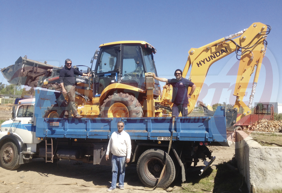 La firma maragata Servial Sur SRL. incorporó una Retroexcavadora H940C Plus Full de 100hp con motor Perkins 1104. En la foto, de Ricardo Pérez Rossi (propietario), Guillermo García (mecánico de Hyundai Equipos Pesados) y el transportista Wilson Castro.