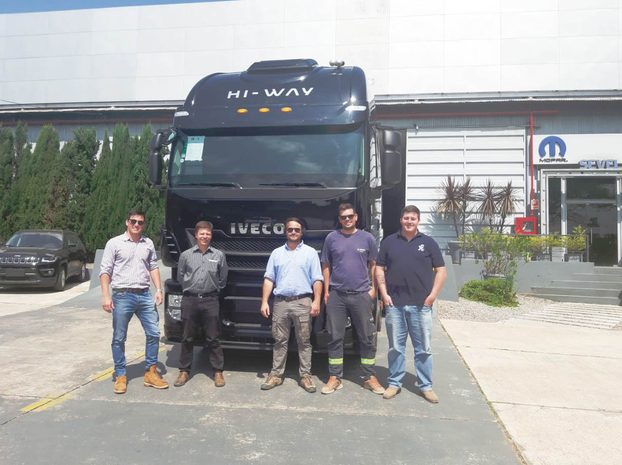 La firma Perfice S.A. adquirió un Iveco Stralis HI WAY 800S48 TZ 6x4 motor 12880cc 480cv de 80T de CMT. En la foto: Juan Martin, Jorge y Gabriel (Perfice S.A.), y Mario y Martin de Sevel Uruguay S.A.