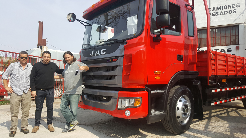 JAC LATINOAMERICA (EXISTIR S.A) Entrega el camión JAC 160HP GALLOP a la empresa CABESAS BIER S.R.L de Tacuarembó. En la foto Rodrigo Ríos (Propietario) su chofer y Gerardo Echave (Administración, ventas y Leasing)
