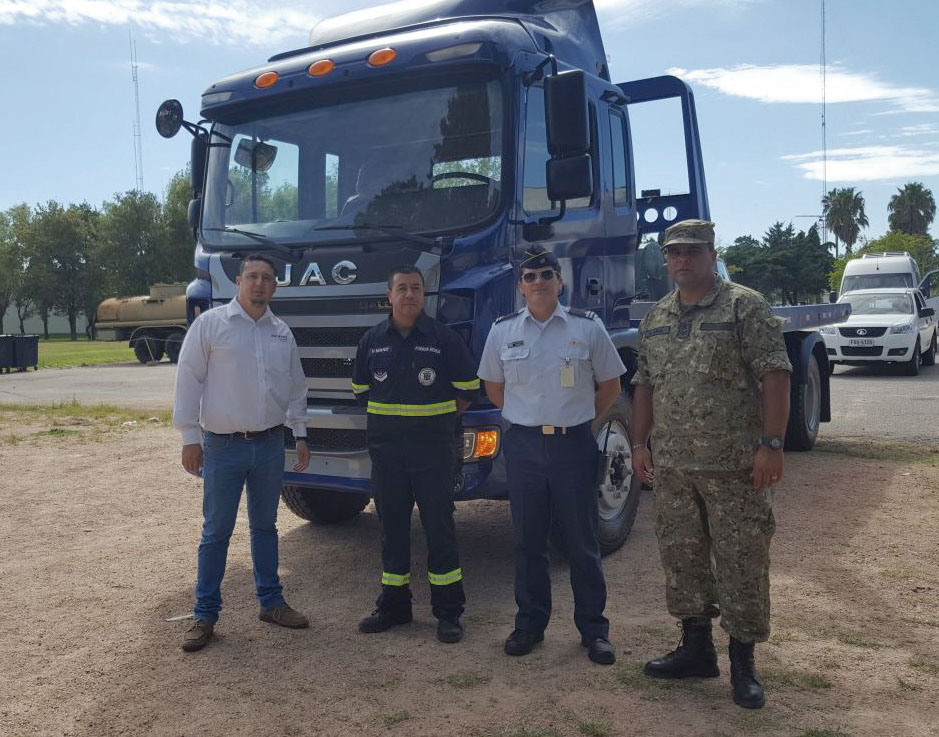 JAC Latinomarica EXISTIR S.A entregó a la Fuerza Aérea el camión 190HP GALLOP con plataforma de traslado de vehículos Viscazo. Recibió las llaves de manos de Gerardo Echave (ventas) el Sargento Néstor Sena, Cabo1° Héctor Manzi y Capitán Oliva.