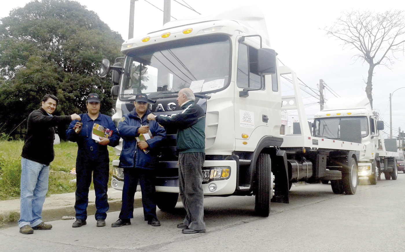 Jac Motors Latinoamerica (EXISTIR S.A.) entregó 2 camiones Jac 160HP Gallop con plataformas hidráulicas levanta coches a el Ministerio del Interior. En la foto tenemos a Marcelo Armoa (Gerente de repuestos de Jac), Hugo Cabrera (vendedor) y personal del Ministerio.